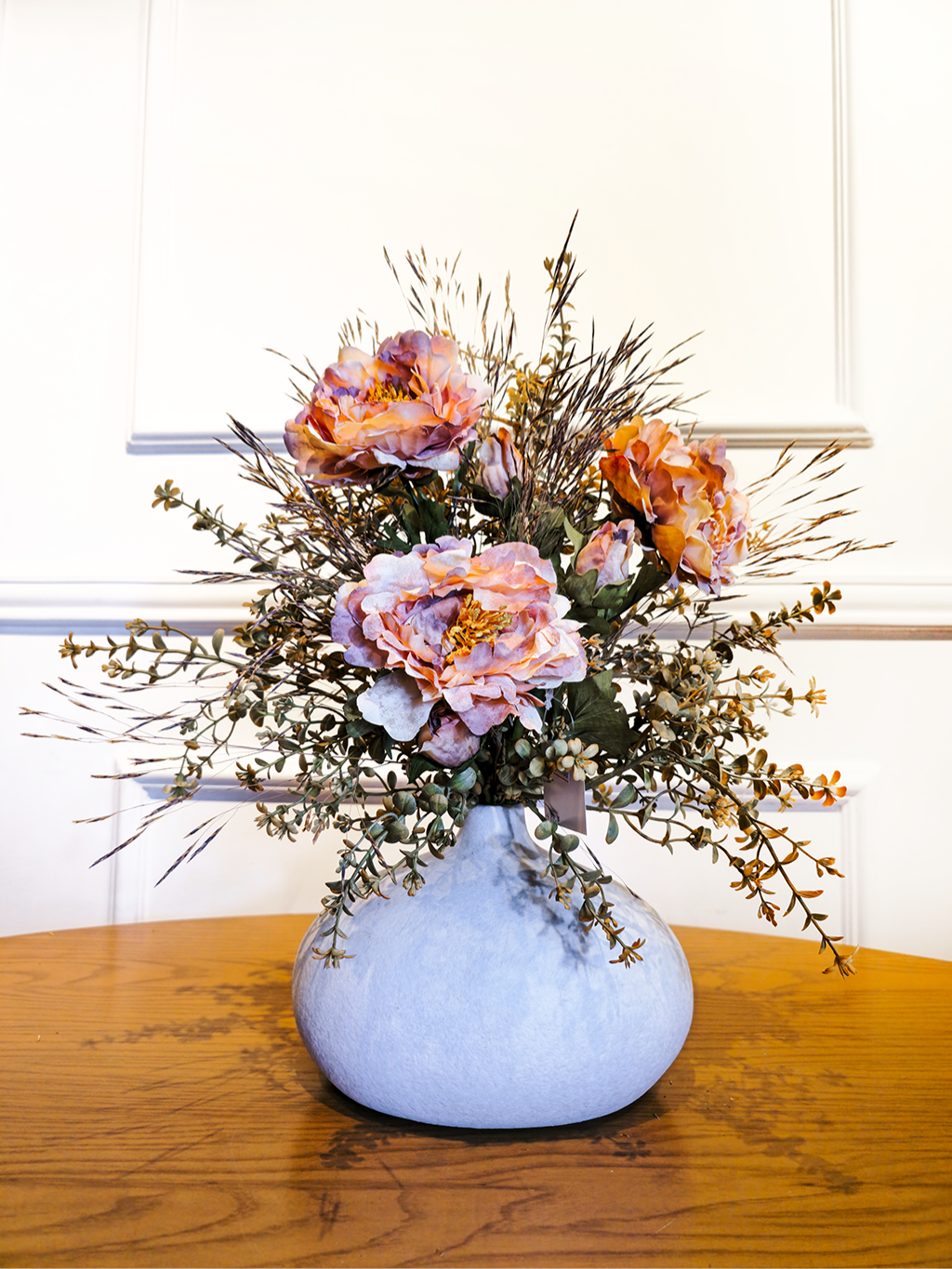 Seu design celebra a transição da natureza, utilizando texturas que reproduzem fielmente a beleza das plantas na meia-estação. O vaso de vidro fosco branco, selecionado exclusivamente para esta coleção, complementa a composição com um visual robusto e elegante, garantindo que o arranjo se torne o ponto focal de qualquer móvel ou ambiente.