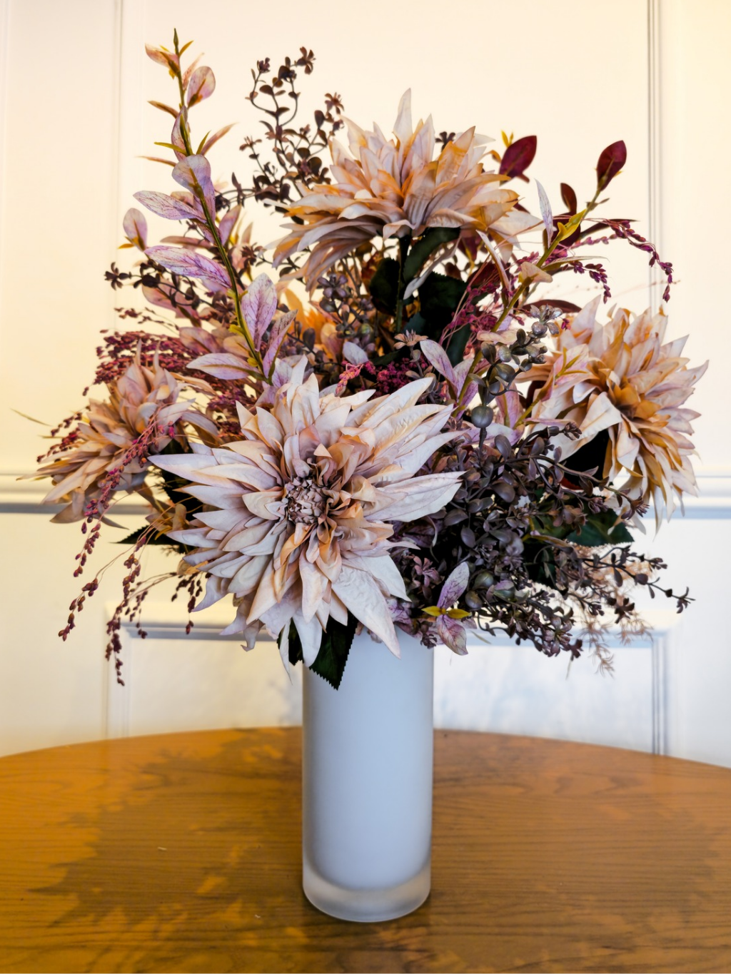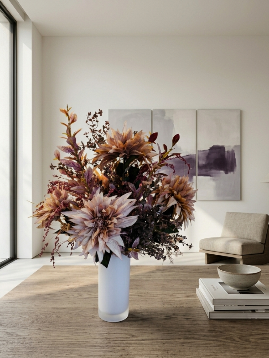 Seu design celebra a transição da natureza, utilizando texturas que reproduzem fielmente a beleza das plantas na meia-estação. O vaso de vidro fosco branco, selecionado exclusivamente para esta coleção, complementa a composição com um visual robusto e elegante, garantindo que o arranjo se torne o ponto focal de qualquer móvel ou ambiente.