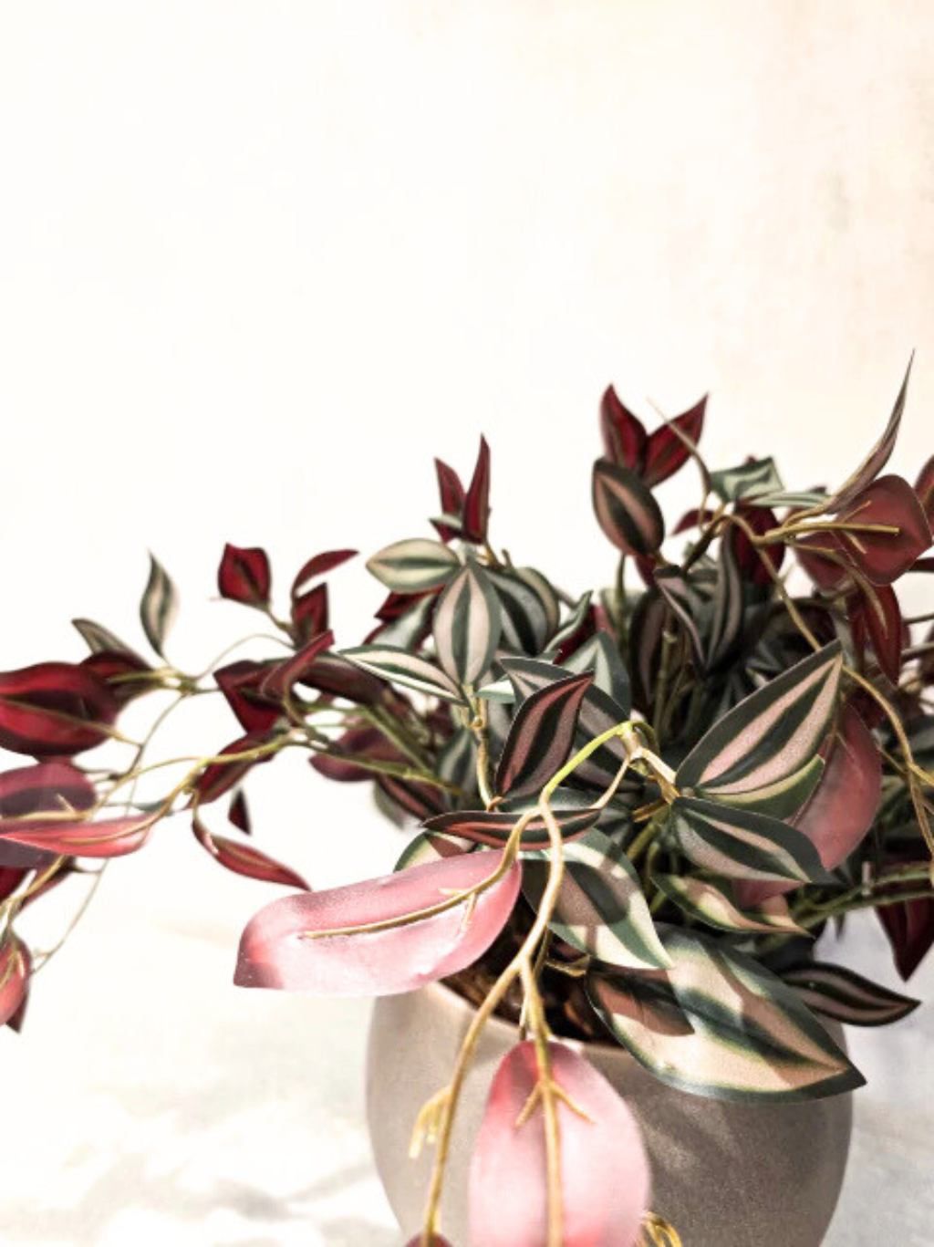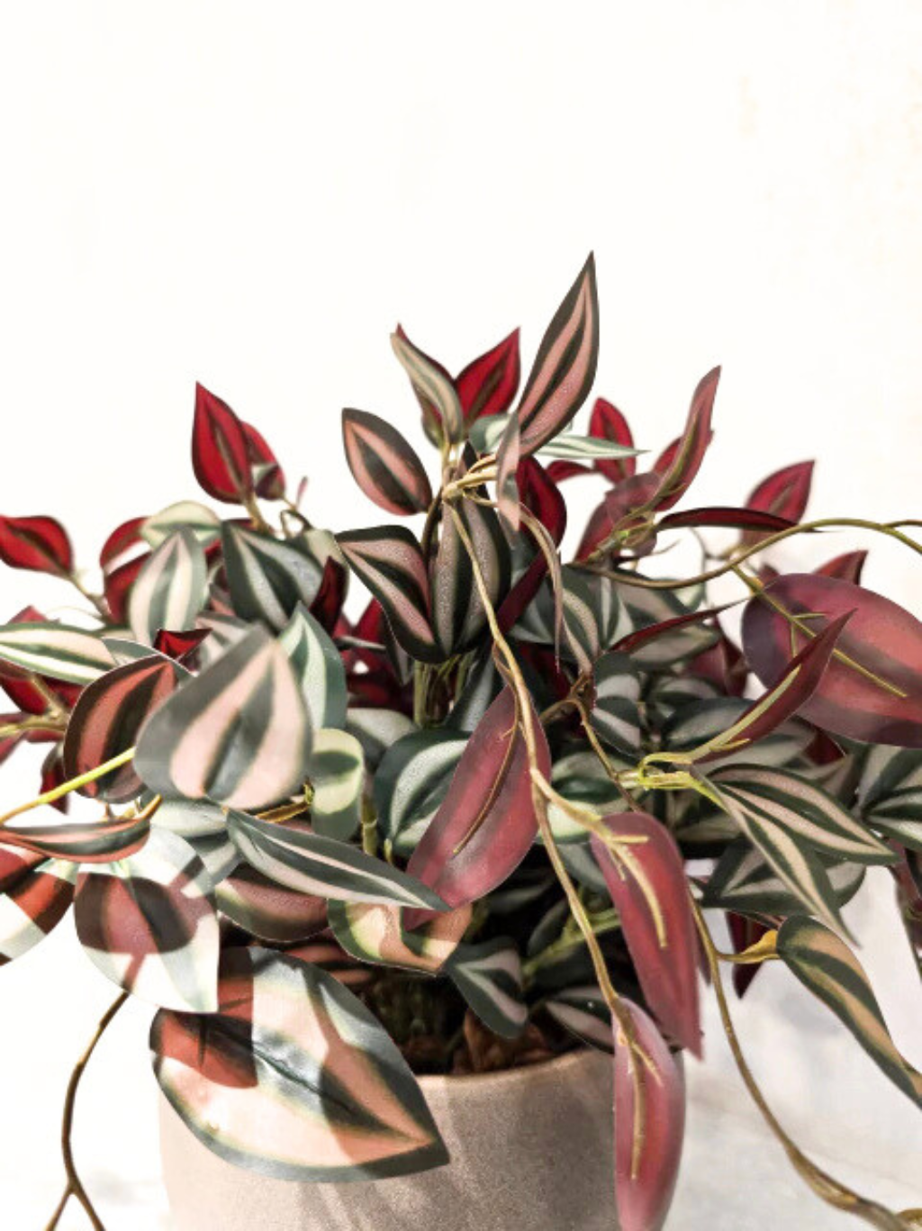 - Composição: Arranjo completo de folhagens permanentes (artificiais de alto padrão) com aparência natural, em tons de verde e vinho + Vaso de cerâmica.