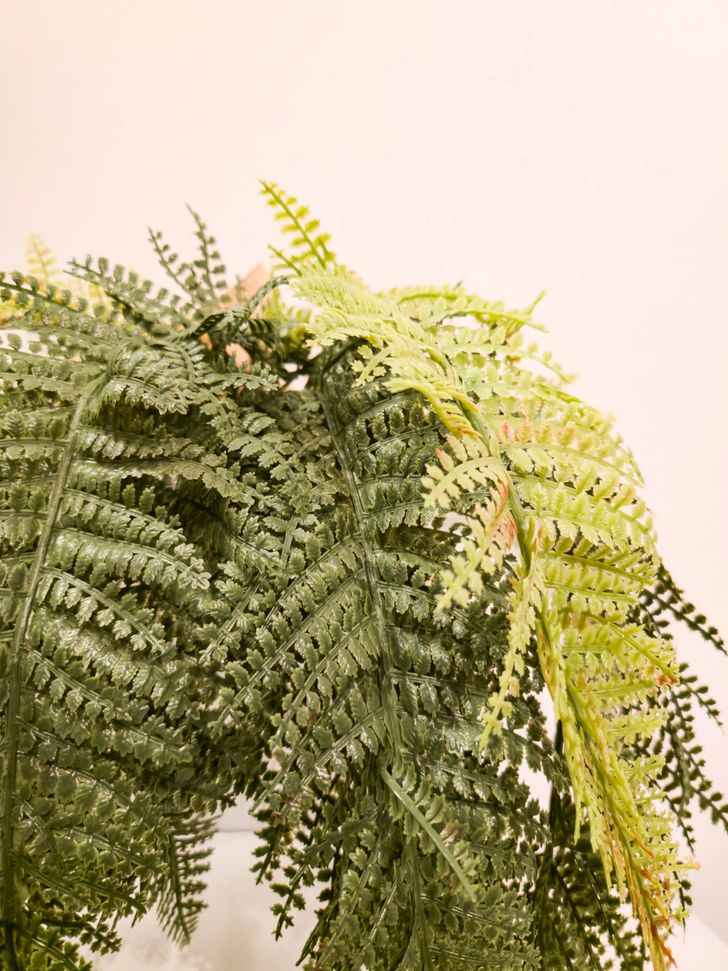 Nosso arranjo permanente de Samambaia Rendada G é a peça ideal para quem ama o efeito cascata e o volume exuberante desta folhagem clássica, mas busca a praticidade de uma planta artificial. O tamanho "G" (Grande) garante um impacto visual marcante, e a qualidade da folhagem imita com perfeição a delicadeza e a textura da samambaia natural.